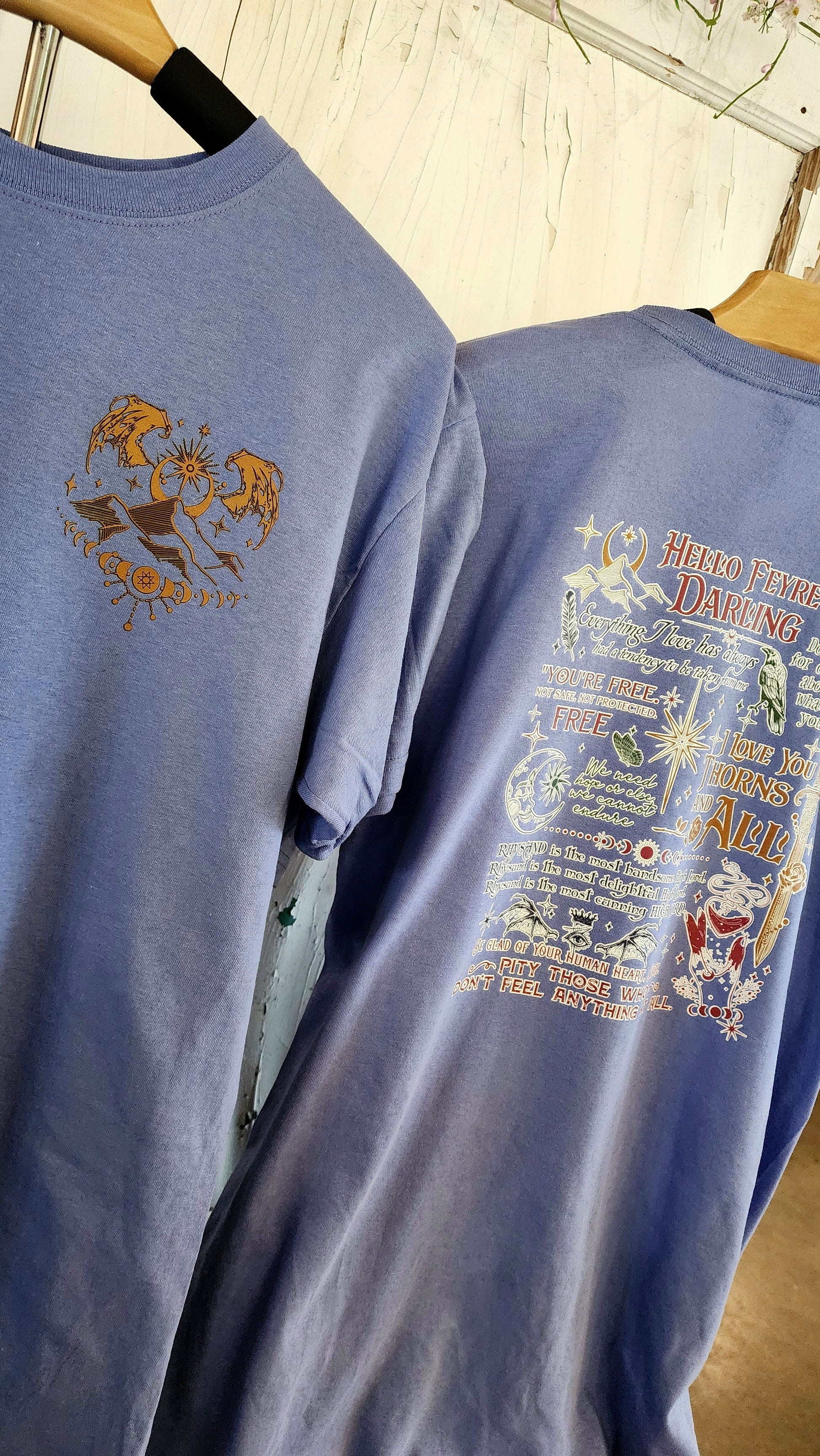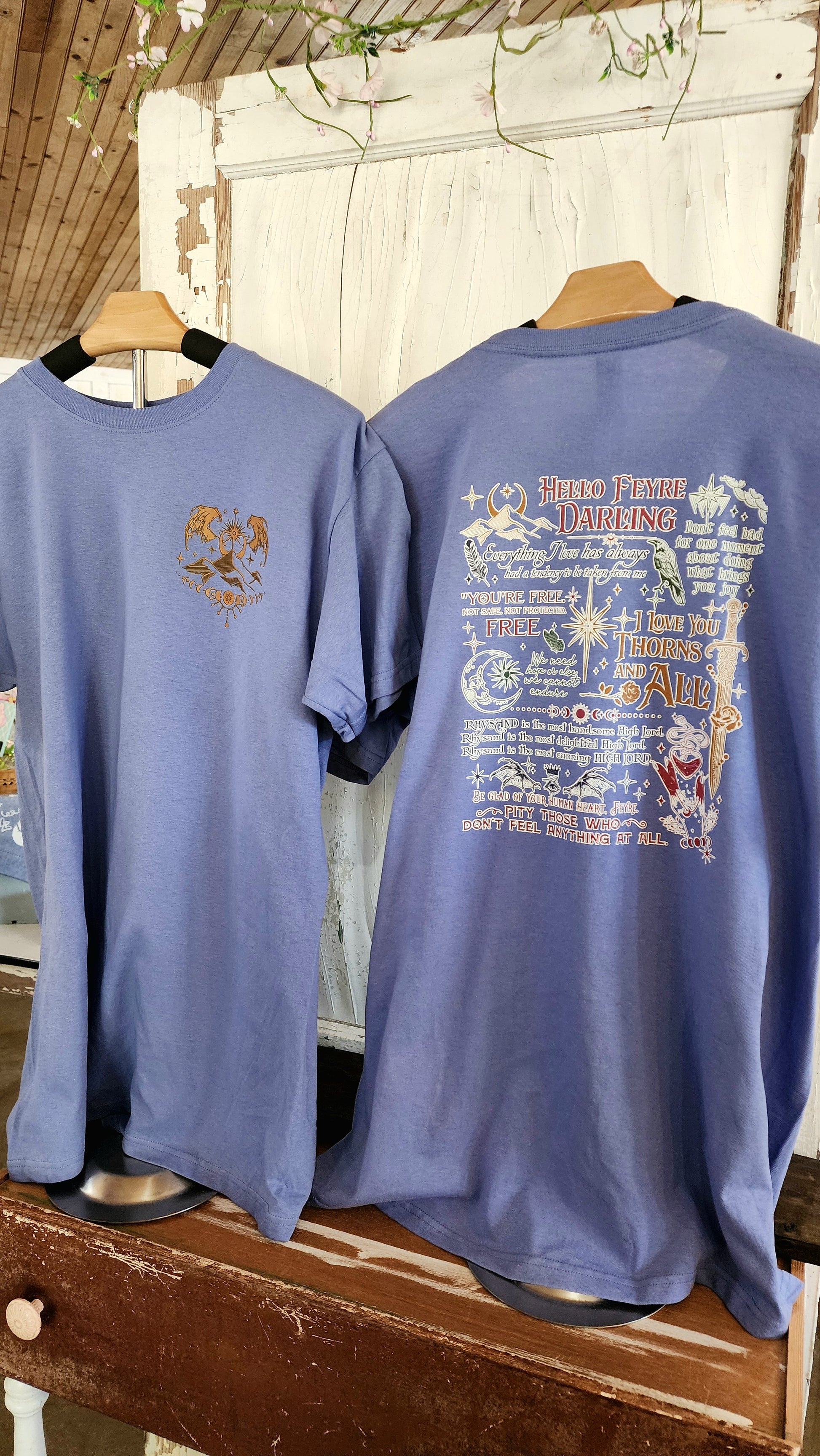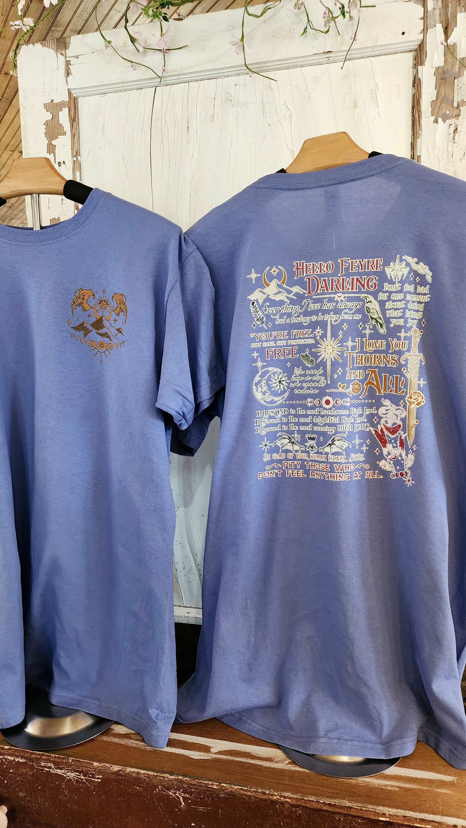 Experience the magic of ACOTAR with the Hello Feyre Tee. Show your love for Rhysand with a graphic design featuring the City of Valaris on the front corner pocket area. The back of the tee is adorned with beloved words from Rysand. Wear it and be transported to the world of Sarah J. Maas!