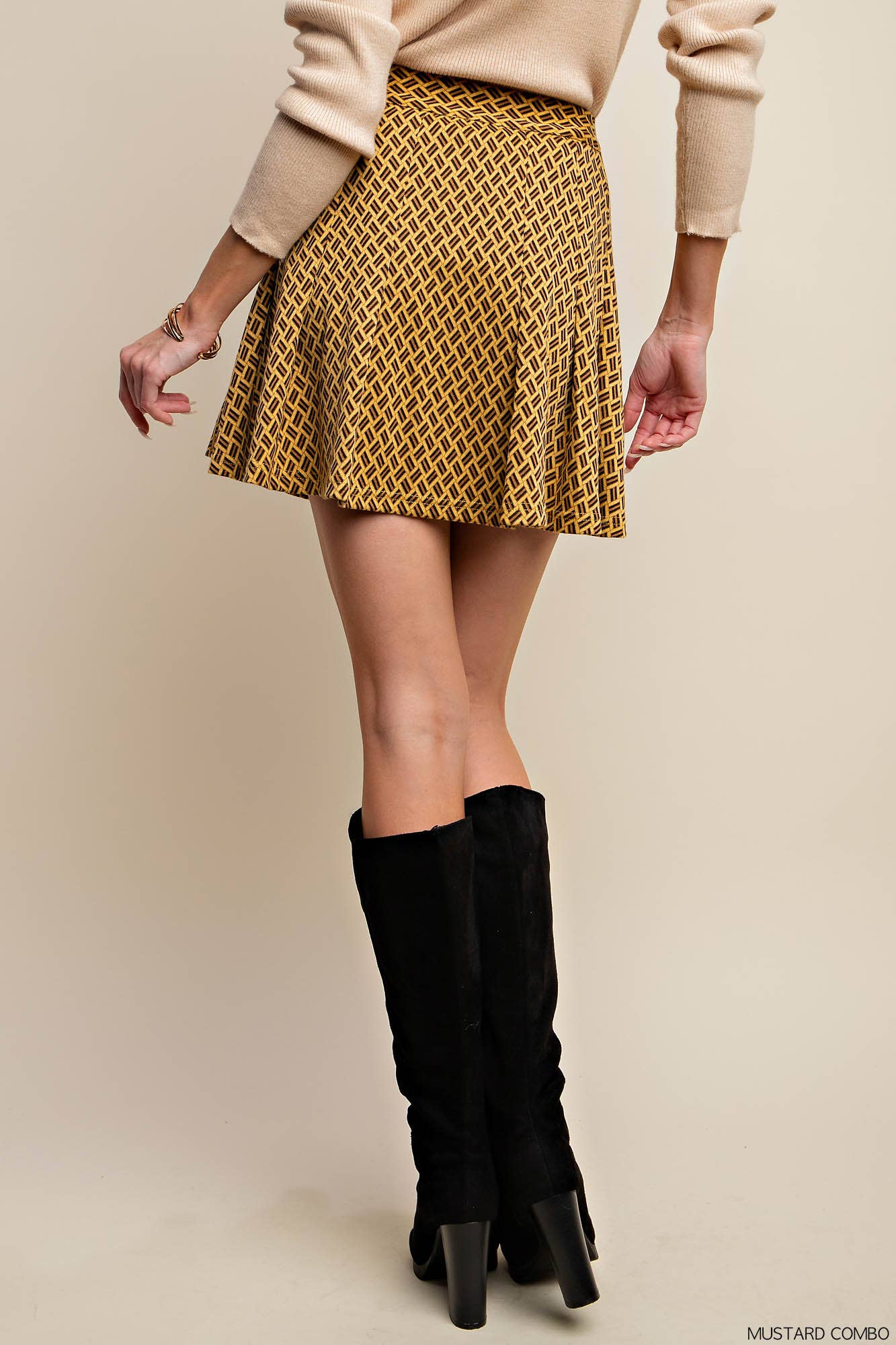 Get ready for the autumn season in style with our Mustard Knit Jacquard Pleated Mini Skirt! With its chic design and versatile options, this skirt is perfect for pairing with your favorite booties or tall boots. From day to night, this skirt has got you covered!