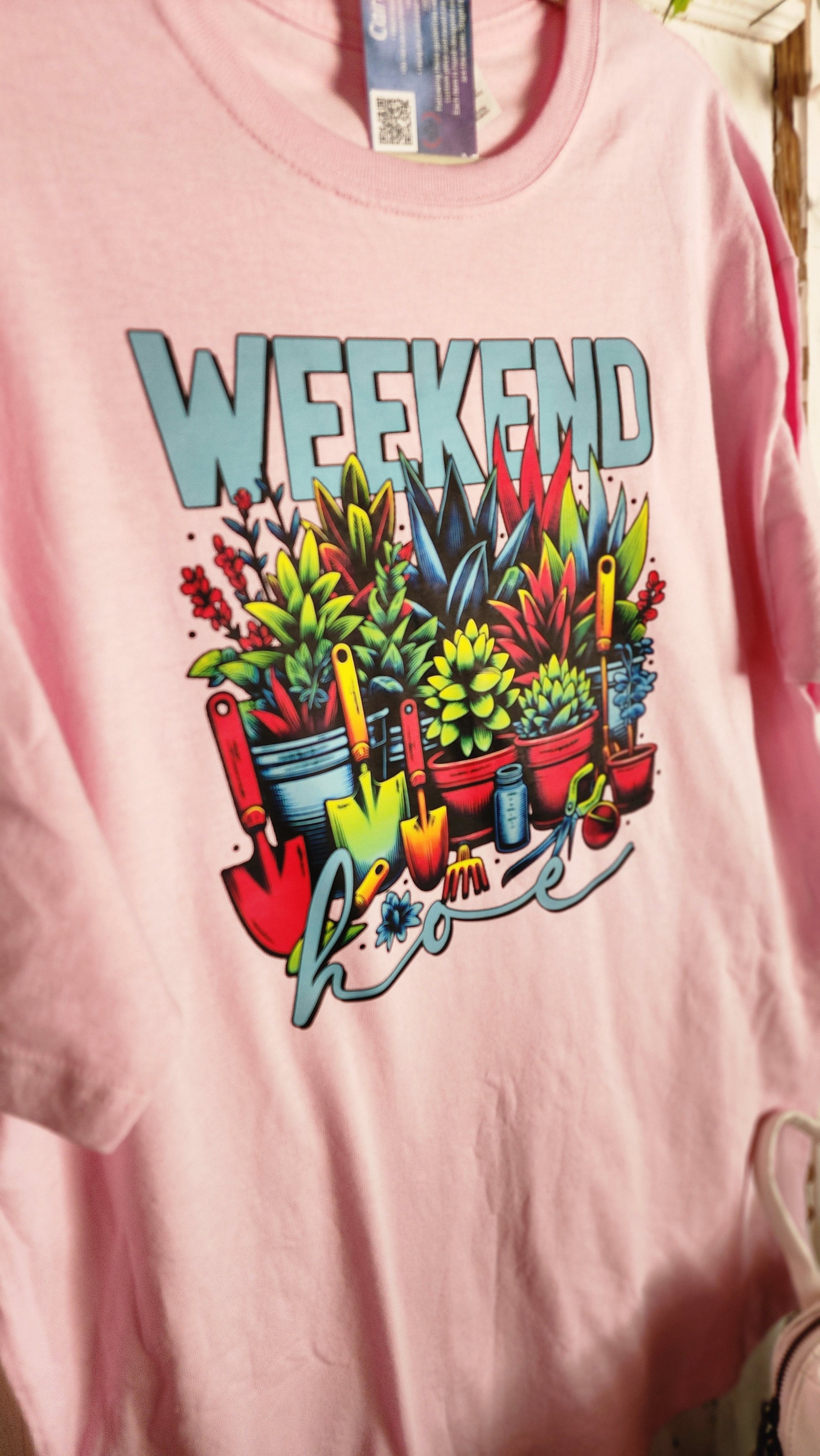 Introducing our Weekend Hoe Graphic Tee! Show off your love for both plants and weekends with this bold and bright graphic featuring a playful pun. Made with a pretty pink fabric, this tee is perfect for any plant lover looking to add some fun to their wardrobe.